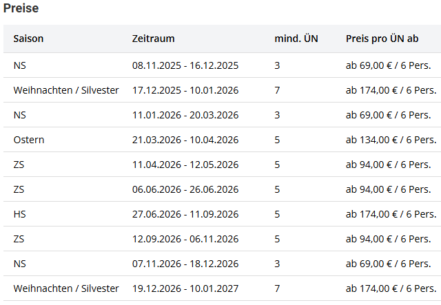Alle Preise zzgl. einmalig 115,00 € Endreinigung